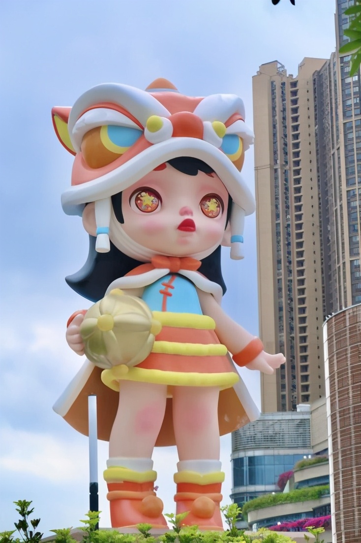 这座总高度达12米的原创潮玩IP巨型雕塑——“Laura·醒狮”,头戴醒狮帽、手拿绣球,身穿中国红的舞狮服,国潮元素满满!