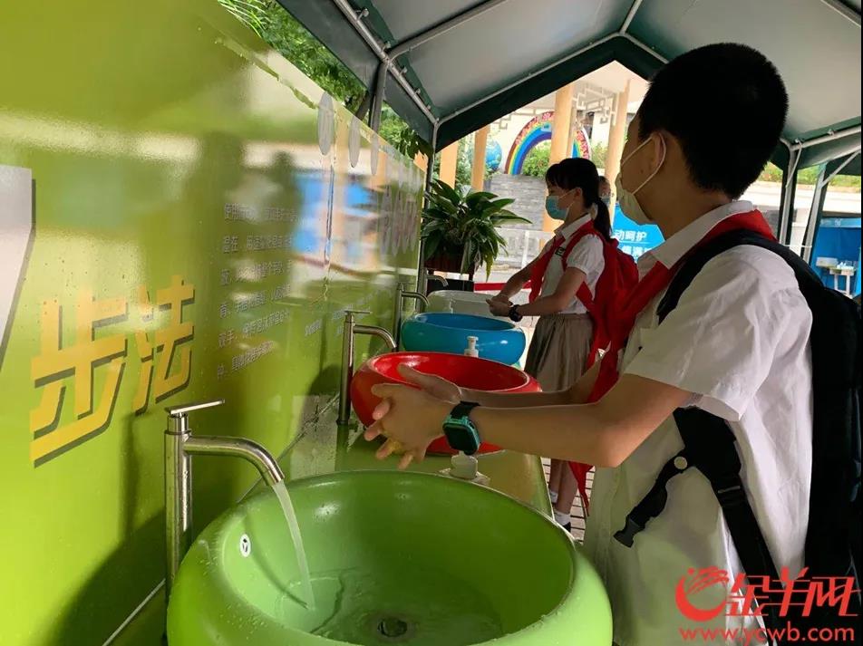 在华师附小,学生进入学校后,将按照标准洗手七步法,洗干净手再进入教学楼。羊城晚报全媒体记者 陈亮 摄
